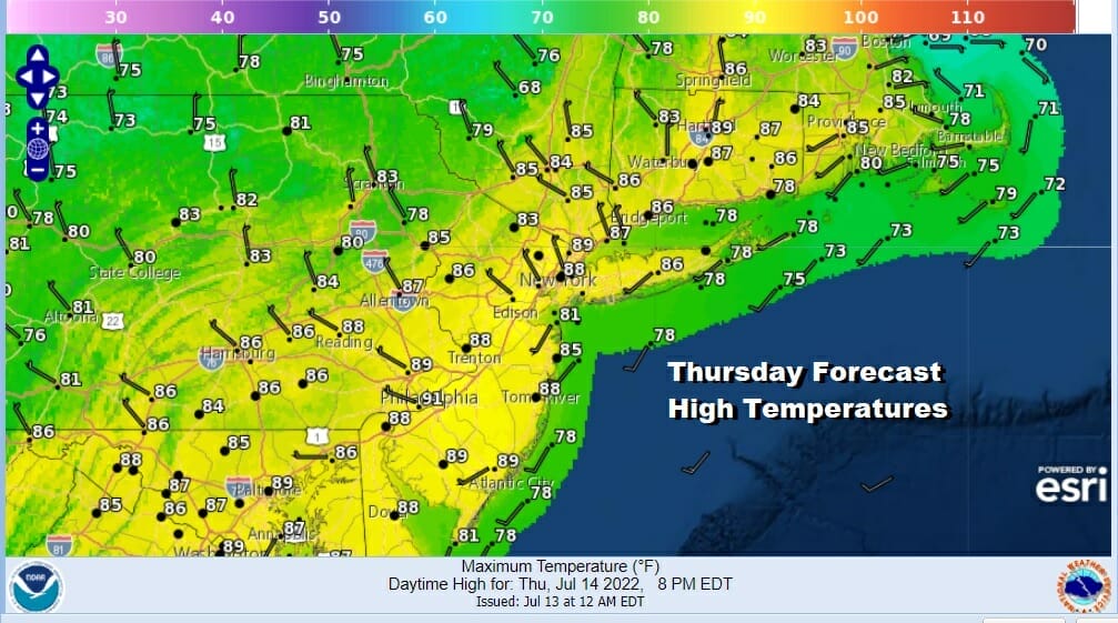 We will do it again Sunday with sunshine very warm to hot and humid conditions. We will throw in the chance for a scattered shower or thunderstorm with the best chances inland. Highs will be in the mid 80s to near 90 degrees. Temperatures will be a little cooler along the shore.