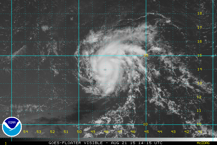 The Hurricane Centers track forecast remains mainly unchanged. Since the hurricane is within 1000 miles of land people in the Northern Leewards need to pay closer attention to this. The storm is still forecast to weaken as it approaches the Leewards and then it will have a problem as it interacts with the land if that track holds. The visible satellite picture this morning shows a well defined circular eye but you can see just how small this really is. It is only several hundred miles across. The storm passed 75 miles to the north of a Noaa buoy overnight and it could only mange a 20 knot wind. The area of gales is small and the area of hurricane force winds even smaller. It is like hitting the bulls eye of a target. A NOAA plane will be checking the storm out later today.