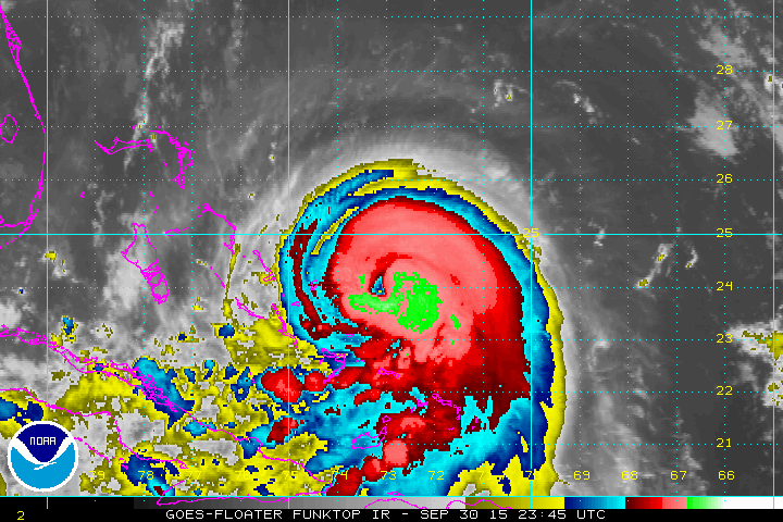 BULLETIN HURRICANE JOAQUIN INTERMEDIATE ADVISORY NUMBER 12A NWS NATIONAL HURRICANE CENTER MIAMI FL AL112015 800 PM EDT WED SEP 30 2015 ...HURRICANE HUNTER AIRCRAFT FINDS JOAQUIN STRONGER... SUMMARY OF 800 PM EDT...0000 UTC...INFORMATION ---------------------------------------------- LOCATION...24.0N 73.0W ABOUT 95 MI...150 KM E OF SAN SALVADOR BAHAMAS ABOUT 80 MI...125 KM NE OF SAMANA CAYS BAHAMAS MAXIMUM SUSTAINED WINDS...105 MPH...165 KM/H PRESENT MOVEMENT...SW OR 225 DEGREES AT 7 MPH...11 KM/H MINIMUM CENTRAL PRESSURE...954 MB...28.17 INCHES