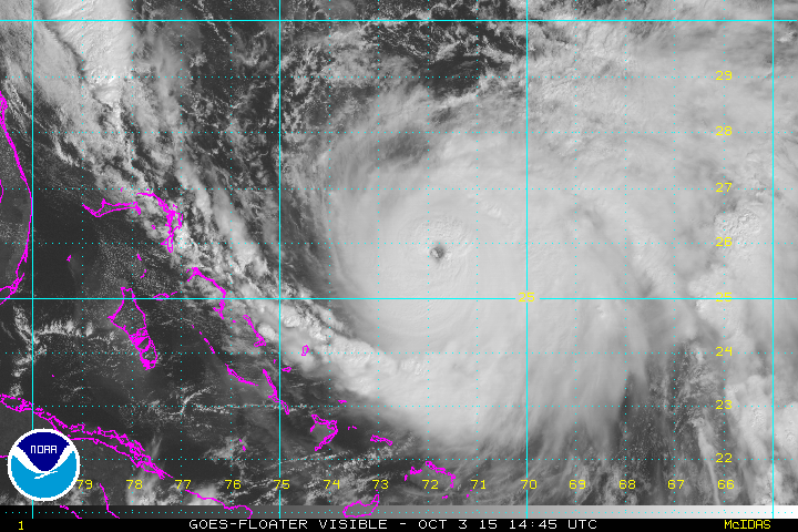 Hurricane Joaquin continues has begun to strengthen again as the eye is become very well defined and pressures are dropping again by about one millibar per hour so it is once again a Category 4 Hurricane with max winds at 130 mph.