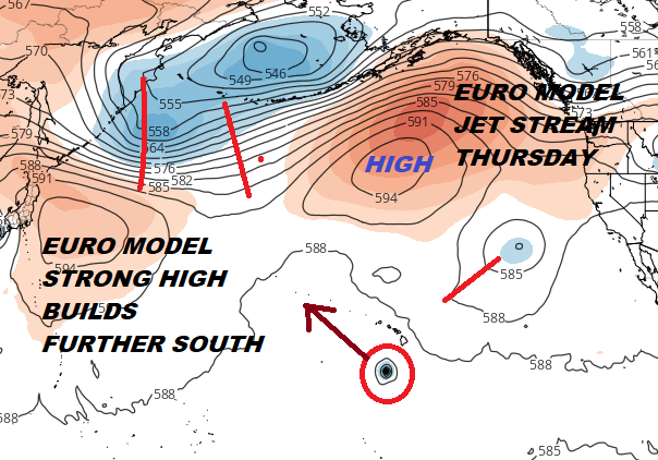 The big issue is the upper high to the north. The problem is that unlike in the case of Hurricane Hector 2 weeks ago, the high is further north. There are also troughs on either side which is creating a weakness in between. Lane would be able to gain some latitude here (move further north) before it hits that upper high and whatever is left of it is deflected back to the west. The European model which is the furthest south of the weather models today handles this a bit differently.