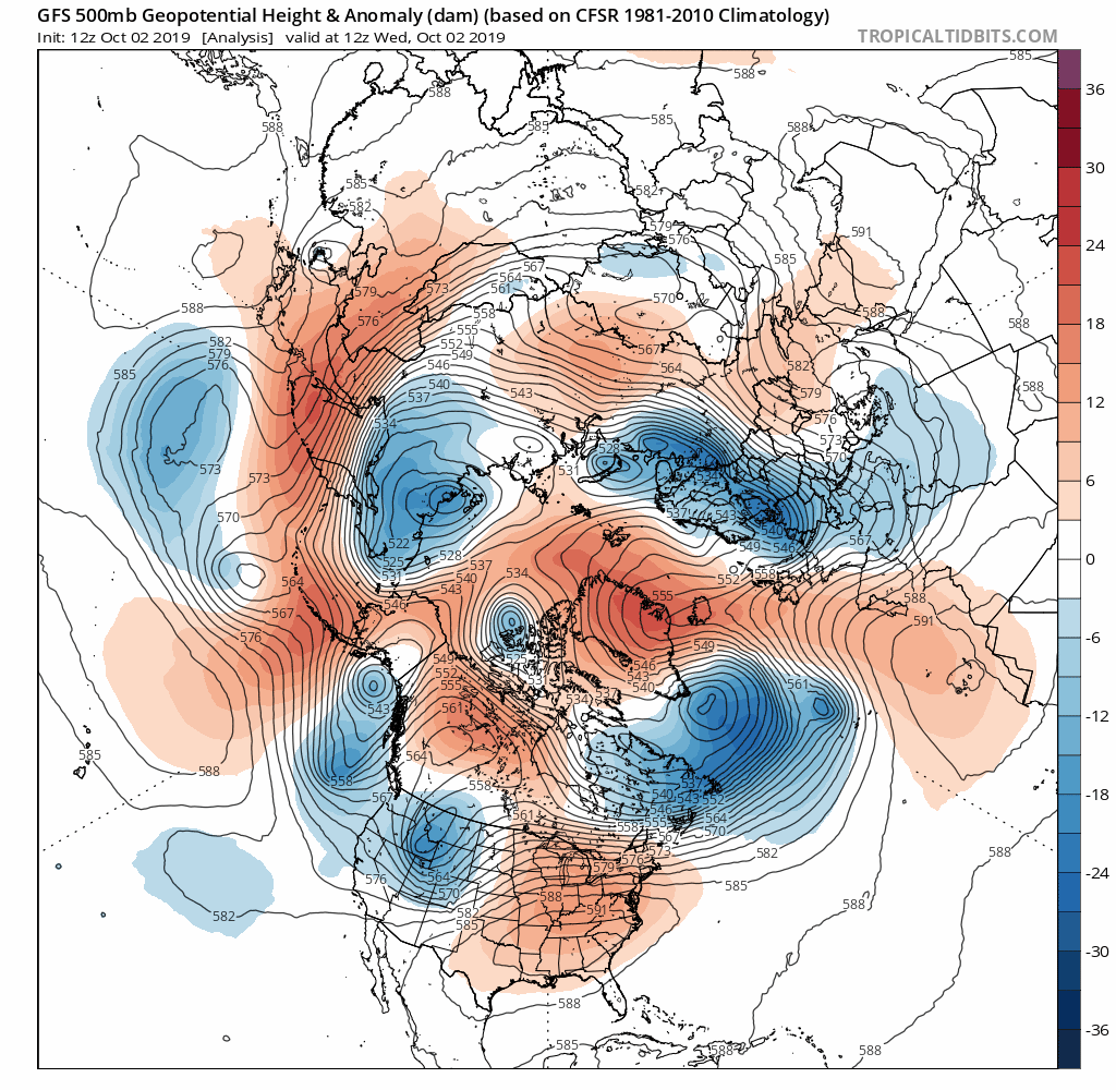The heat ridge this morning is sitting there and you can see Lorenzo in the upper right of the jet stream map rotating around a strong upper low off the southern tip of Greenland. To our west we have the remnant trough of the weekend snow storm in Montana and another trough off the west coast. Watch what happens across the Northern Hemisphere over the next 10 days.