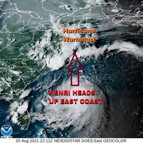 Weather conditions begin to deteriorate during the early morning hours Sunday as the winds begin to increase in the warning area and rain develops around daybreak. This will last about 6 to 8 hours of heavy rain and the strongest winds. Expect the strongest winds to be east of the storm track with the heaviest rains to the west and north west. 2 to 4 inches of rain is likely west of the track. Henri will approach and possibly come ashore as a category 1 hurricane before weakening to a tropical storm and moving inland in New England spreading heavy rain northward. The remnant low of Henri will move northeast late Sunday night and Monday and weather conditions in the warning area will start to improve Sunday night with better weather on Monday though there still could be some leftover showers. More on Henri and what to expect on tonight’s Joe & Joe Weather Show.