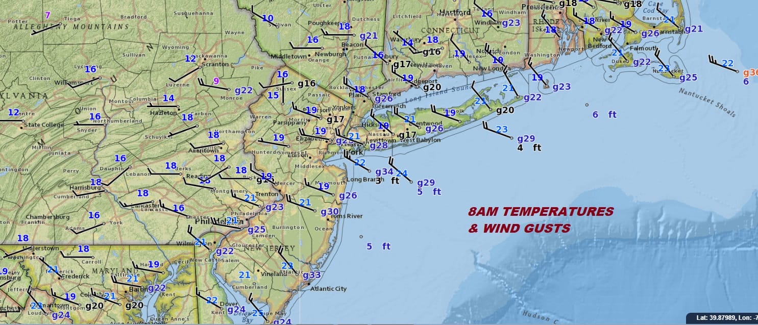 Temperatures in the teens to near 20 this morning combining with gusty winds up to 30 mph are making for a very cold morning and a very cold day ahead. Wind chills right now are in the single digits and it does look and feel like a day in January. Temperatures today will not get out of the 20s and typically this time of year we should be running to the mid to upper 40s. If you want to Seasonally adjust this air mass for January it would be a day in that month where the high temperature couldn’t make it back to 20.