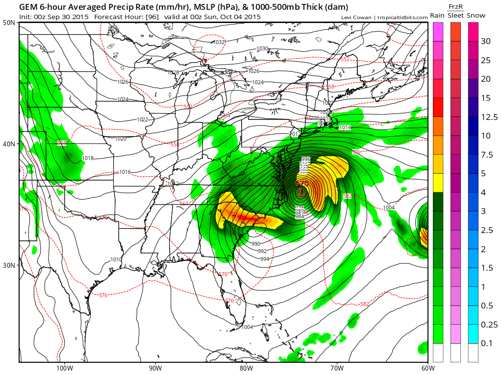 The GFS model takes Joaquin into Virginia Beach from the east and this would be a big hurricane hit for this area. What sets this storm apart for others like this is the surface set up along the east coast. Huge high pressure iwll be building across New England and Eastern Canada to the Western Great Lakes creating an extremely tight pressure gradient from Boston southward. Gales will be everywhere up and down the east coast in this set up. Coastal flooding and severe beach erosion will occur as well as the northeast winds will be blowing for a good 3 days from Thursday into Saturday before the hurricane were to make landfall. Then there is the rain which the model sets up for some overrunning rains Thursday night into Friday night and the again Saturday night and Sunday as the hurricane moves inland.