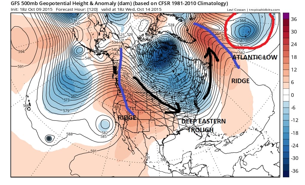 By next FRIDAY. The northwest flow aloft is strong and still holding in place which will carry even colder air into the East for next weekend. Now on both the Wednesday and the Friday map I have singled out the low in the Eastern Atlantic that is pretty much in the same spot. This is very important to the overall long range pattern.