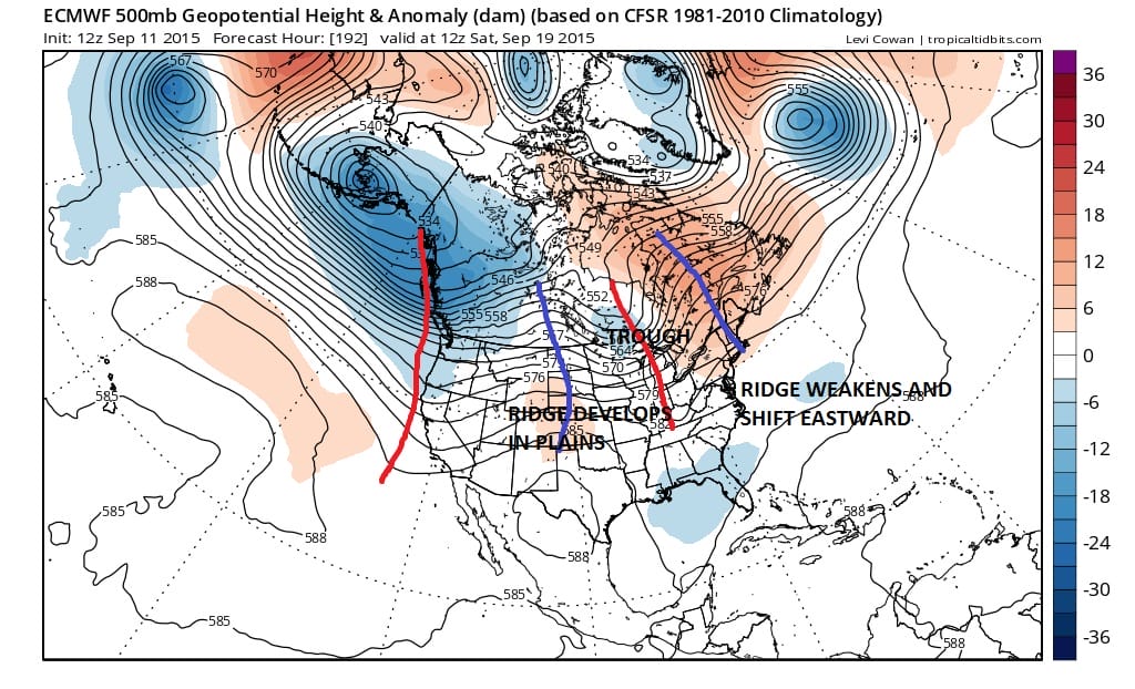 The players are all in position. Strong ridge in the east, deep trough in the west, and a strong southwest flow from the southwest into Eastern Canada. You can’t get a much warmer look than this unless the ridge were a little further west and north but this is formidable enough to keep things very warm and also very dry in terms of rain. The next real change doesn’t appear until next weekend as the ridge in the east weakens some and moves east while a trough develops in the Great Lakes.