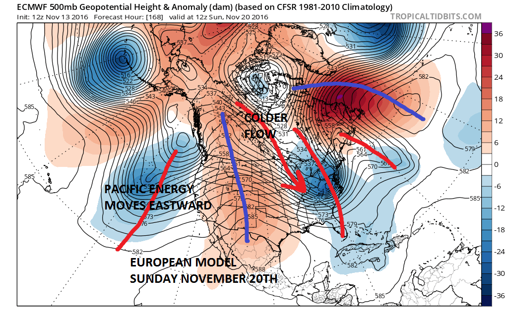Now in terms of the specifics there is lots of uncertainty. The process of pattern change is often a grinding grueling process that doesn’t occur at some magic moment. The first system that might set the ball in motion is the system that moves to the East Coast next weekend. The upper air has a picture of a colder flow with a ridge of high pressure in the west and a strong ridge in the Atlantic building between Labrador and Greenland.