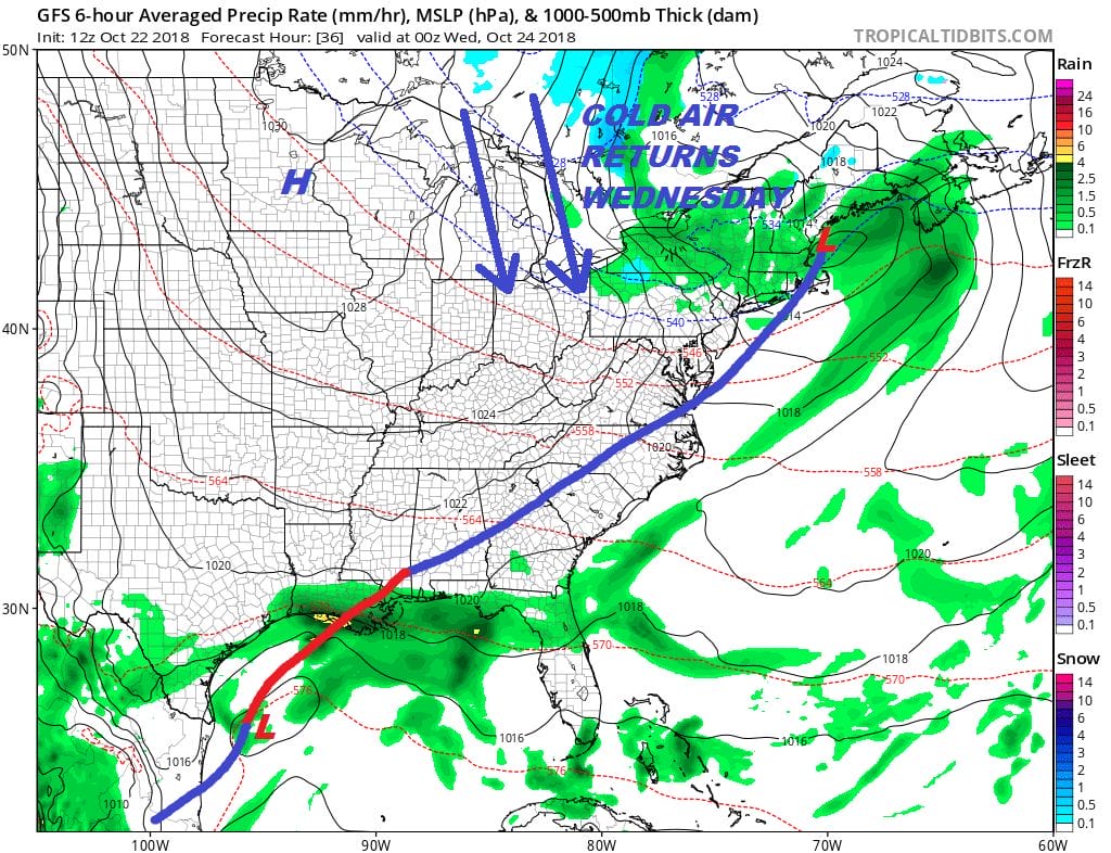 If this were winter time no doubt that the snow and cold weather weenies would be excited about a cold high to the north and a Hudson Valley wind. This is usually the recipe for consistent cold that could set the table for snow if and when the next storm system approaches. This however is late October. The cold air for this time of year is indeed cold with temperatures forecast to be 10 to 15 degrees below average for the rest of the week. No rain is forecast through Friday. Dry weather and some sunshine is forecast but highs will only be in the lower 50s Wednesday and in the 40s to near 50 at best Sunday and Monday. Thursday and Friday morning will be cold and we may see the few remaining areas that have avoided lows of 32 or less finally capitulate.