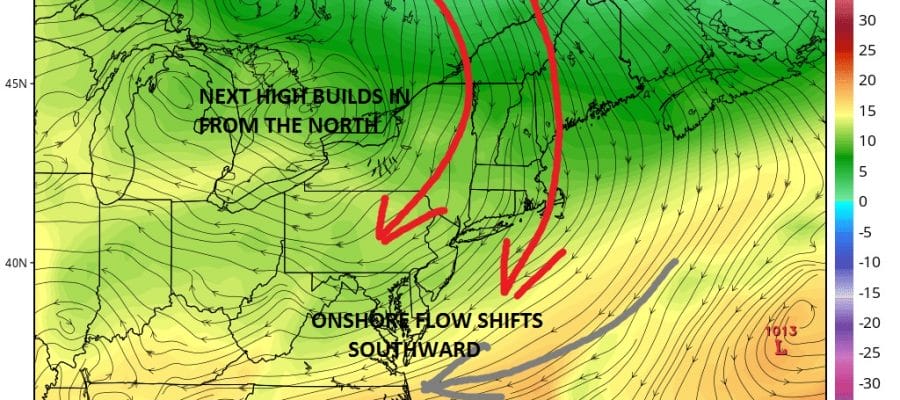 Once this flow relaxes and it will later tomorrow we see the next high beginning to build in. Winds will then become more north northeasterly over time which brings down dry air from the north and northwest so that we should be back to sunshine Wednesday and Thursday. The strongest onshore flow shiftst southward to Virginia and North Carolina in the meantime.