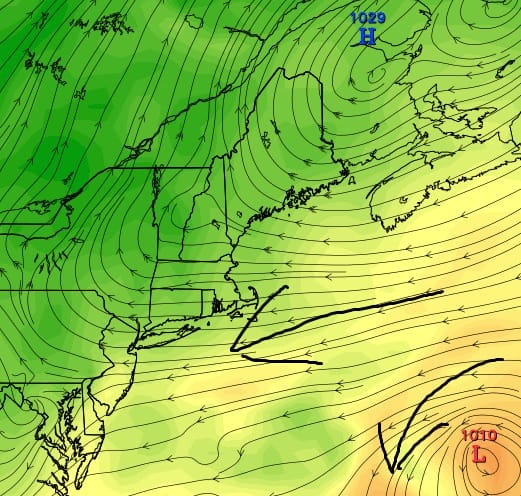 An onshore flow which is how we describe winds that are blowing from the direction of the ocean onshore..that is a wind with an easterly component or for Long Island in the summer it is the south wind as well as the east wind. In this case we are not talking the normal seabreeze action but when the dominant flow is basically from the east. It usually but not always means nasty weather but not always. In this case it might mean both because it often has to do with where you are in the onshore flow with respect to the position of high and low pressure.