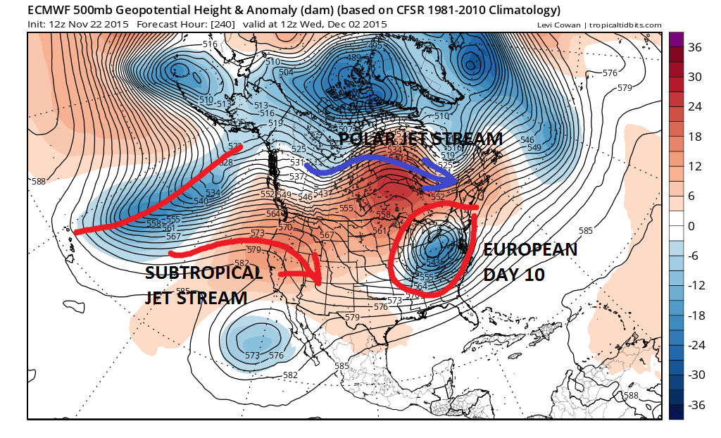 One of the important things to remember about a split flow like this is that whichever jet dominates will be key to outcome. If the northern polar jet were suddenly too strong it could suppress everything south and keep things weak. The streams remain separate except to some degree for the Canadian which has a more “semi-phased” look. The European has a very strong feature in the southern Jet which probably could make things interesting all on its own.