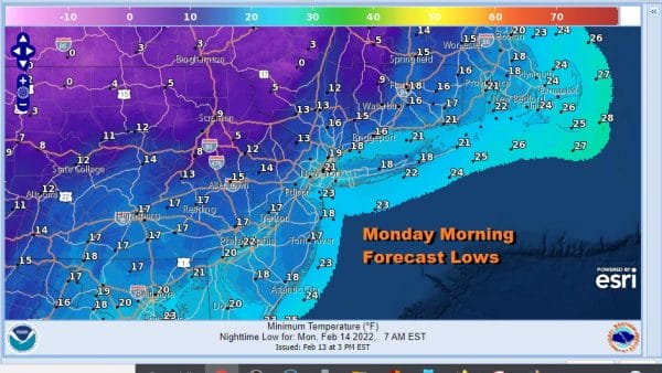 Monday will be a very cold day with sunshine but temperatures will be going nowhere. Highs will be mostly in the 20s. Then get set for another cold night with clear skies Monday night. Tuesday morning lows will be in the teens with single digits again well inland. Tuesday look for sunshine and temperatures will start to moderate a bit in the afternoon though the moderation will be a slow one.