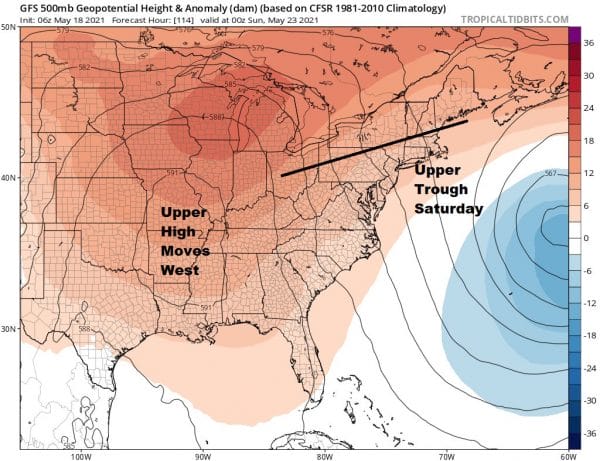 Sunday sees a cold front approaching and ahead of it we should be partly sunny with highs into the 80s. There is the chance for a shower or a thunderstorm when the front passes. Next week we lose the big ridge and the omega block but temperatures should still remain above average with highs in the upper 70s and lower 80s for Monday. Next week’s pattern is going to be a bit different than this week as weather systems will be moving along and that means weather fronts coming through We could be back into the 80s into midweek before another cold front passes through.