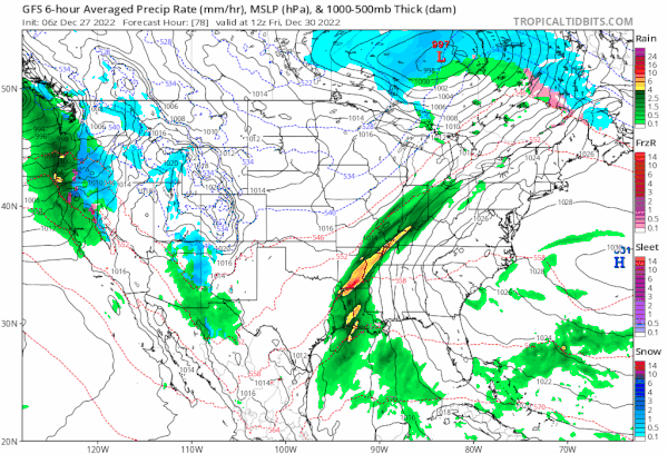 The warm up will continue Friday and into the weekend and that is when we will see low pressure coming out of the Plains and heading to the east. There is no cold air to speak of east of the Rockies which is the exact opposite of what we saw at this time last week when cold air was pouring into the Plains and Rockies and a major storm was starting to take shape. Friday will be a nice sunny warm day with highs in the 50s. Saturday we will be even warmer with cloudy and highs reaching the 50s to around 60. There might be a little light rain or drizzle around late Friday night into Saturday morning along the coast along with some patchy fog. Rain looks to arrive sometime Saturday night, perhaps in time for the arrival of the new year. This does not look to be a big deal rain wise as it lasts in the Sunday New Years Day. A half to three quarters of an inch seems doable.