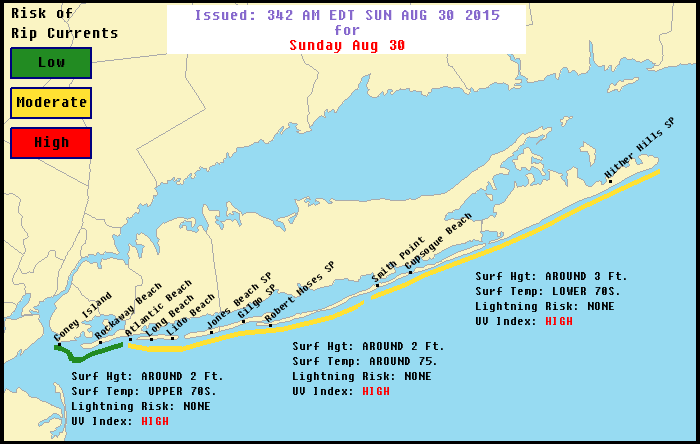 The risk for rip currents today continues along the Long Island South Shore beaches so if you are headed there exercise caution while swimming. Otherwise beach conditions are ideal with plenty of sun and a warm ocean with water temperatures in the mid to upper 70s. No advisories are up for the coastal waters.