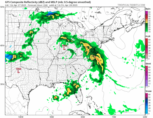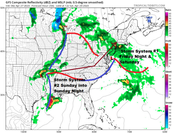 Rainfall amounts from the first round of rain should average around an inch or so with slightly lower amounts to the east and slightly higher amounts to the west. We will catch a break from the rain Saturday night into Sunday morning but then another round of rain will come Sunday afternoon and should be mostly gone by early Monday morning. This is will likely produce another inch or so of rain as low pressure heads up the coast, probably tracking just inland. That slightly inland track should allow temperatures Sunday to get into the 60s.