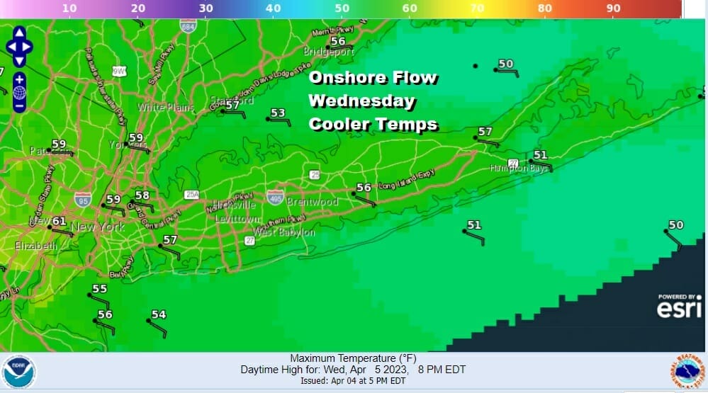 Long Island Onshore Flow Cooler Temperatures Wednesday