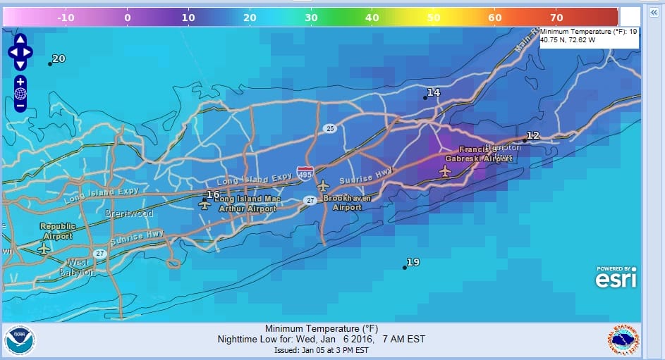 Long Island weather will see another very cold night ahead with clear skies and light winds. Even though Long Island is along the coast it can be an amazing place on nights where radiational cooling takes place. It is when skies are clear and winds are light to calm, the heat that the earth has absorbed during the day is radiated back out into space. This can create huge temperature variations especially in Central Suffolk County which can be the radiation capital of the northeast on some nights. Most lows tonight will be in the teens however in the coldest spots like Brookhaven and Westhampton, single digits are likely. At least there is no wind so there is no wind chill factor to make it feel even colder, like last night.
