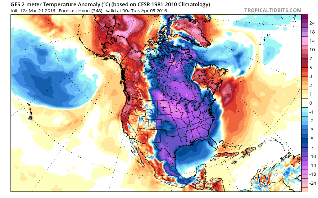 Long Range Cold Early April Temperature Departures from Normal Day 14