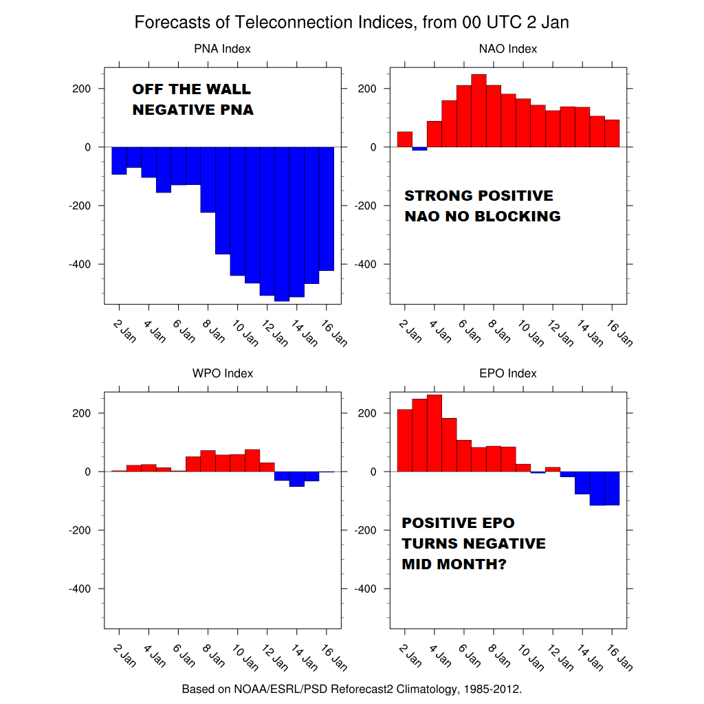 Now when you combine that pressure pattern with the North Atlantic Oscillation you have an even worse scenario. That index is strongly positive but not off the wall like the PNA. The NAO is signalling a west to east flow which means weather systems move along. There isn’t much here to force storms to track further south creating cold conditions from the Great Lakes to the Mid Atlantic states. Cold air is transient at best. It comes in and goes out. It has nothing to hold it in. The East Pacific Oscillation or EPO is the one teleconnection that isn’t terrible. It will be trending negative into this time frame which at least sends shots of cold air eastward from time to time. There isn’t much that changes out through day 16 either which is January 18th.