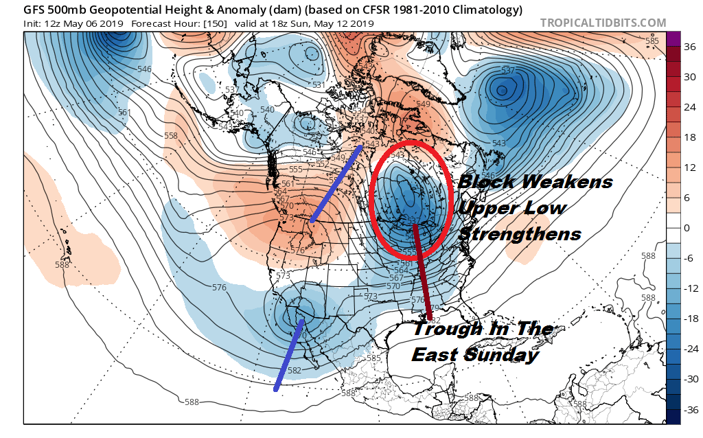 The upper air pattern Wednesday night continues to show the blocking upper high over Greenland into Labrador and a series of short wave troughs coming out of the west. This creates the issues for the end of the week for us as described above but it also sets up issues for Mother’s Day. Saturday should be okay with some sunshine and highs into the 70s. However changes in the upper air create an opportunity for rain arriving later on Sunday Mother’s Day.