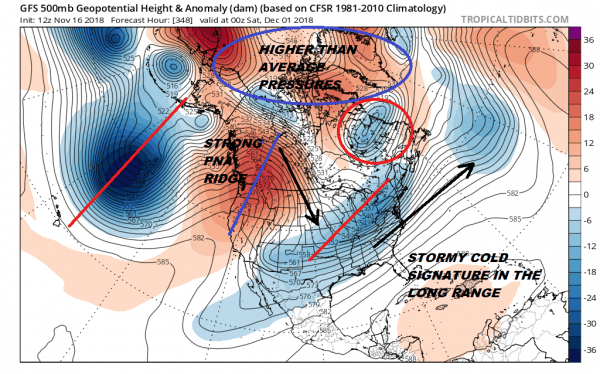 We continue to follow the recent trends of the long range models as they point to a rather dynamic looking pattern developing in the next several weeks. Key to all of this is the collapsing North Atlantic Oscillation or NAO which will displace the jet stream well to the south of normal across the United States. It is under these circumstances that you can see colder than average temperatures in the East. Under the right circumstances you can also get noreasters as we remember last March when the NAO collapsed to extreme negative readings and the outcome was 4 noreasters in 3 weeks.