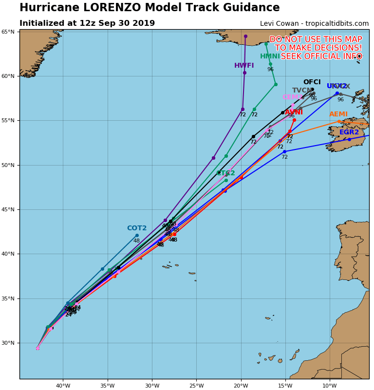 Lorenzo will pass near or just northwest of the Western Azores Tuesday night into Wednesday morning but the large circulation and the expanding area of gales will spread hurricane conditions to the east and tropical storm conditions to the easternmost Azores. From there the track becomes highly uncertain as models struggle with whether Lorenzo gets captured by a developing storm in the North Atlantic, or does it remain a separate feature and tracks close to Ireland on Thursday.
