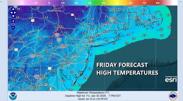 In the meantime Saturday we will have sunshine giving way to some late day clouds. Highs will again not get much above the upper teens and lower 20s. Sunday will be a mostly cloudy day. There is the chance for a period of snow from Coastal New Jersey to Long Island and Eastern & Southern Connecticut. Most highs Sunday will be in the low to mid 20s. Next week starts dry and there is a chance we could see temperatures reach close to the freezing mark for highs Monday and Tuesday.