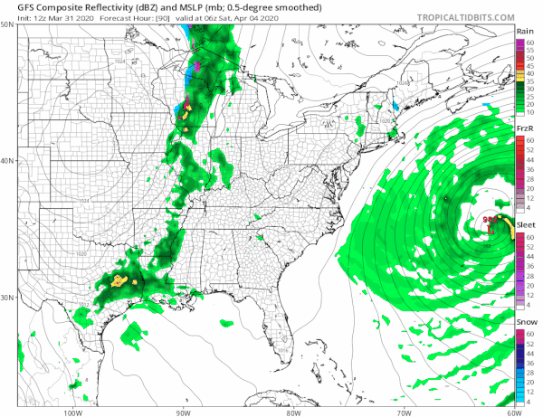 One of the things that happens when you have a spring blocking pattern in place is that you tend to get major ocean storms that develop offshore. These storms tend to get very intense and are often large in terms of the impact. The good news is that 9 times out of 10 these storms are far enough offshore that other than kicking up the surf they aren’t a problem. Sometimes however they tend to move offshore and meander a bit and this creates opportunities for some moisture to back westward or even southwestward from New England. This seems to be the issue going forward tonight and lasting into Friday.