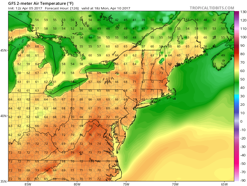 The warm up will be a sunny one so we will be able to enjoy it. Depending on the wind direction even coastal areas will participate though local sea breeze conditions will develop during the afternoon and evening hours. We may be able to squeeze out Wednesday depending on the timing of the next cold front.