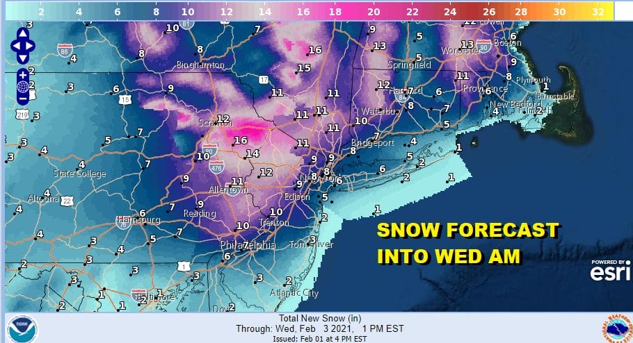 The map above shows the snowfall forecast beginning at 4pm today and continuing through Tuesday night. These are not final totals but additional snow that is forecast to fall on top of what already is on the ground.