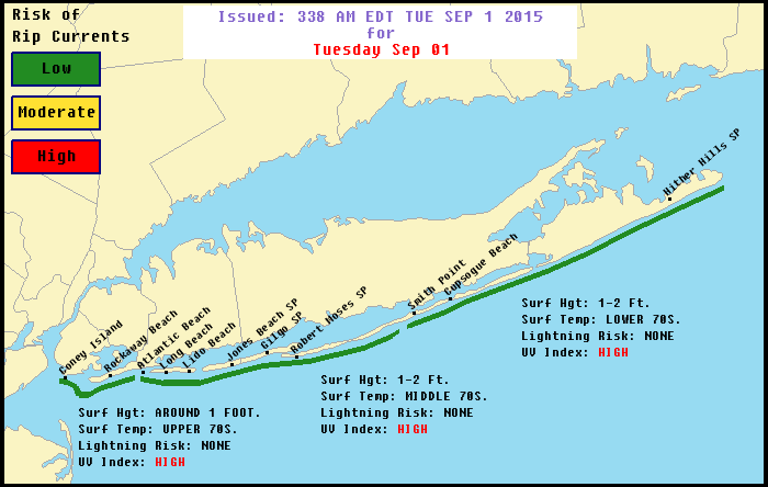 Beach and marine conditions are almost ideal today with lots of sun, low risk of rip currents, a reasonable ocean, warmest water temps of the season, and no thunderstorms. I can’t find a negative here. If the kids are back in school today, this is a great day to sneak down for a few hours in a relatively crowd free environment so enjoy.