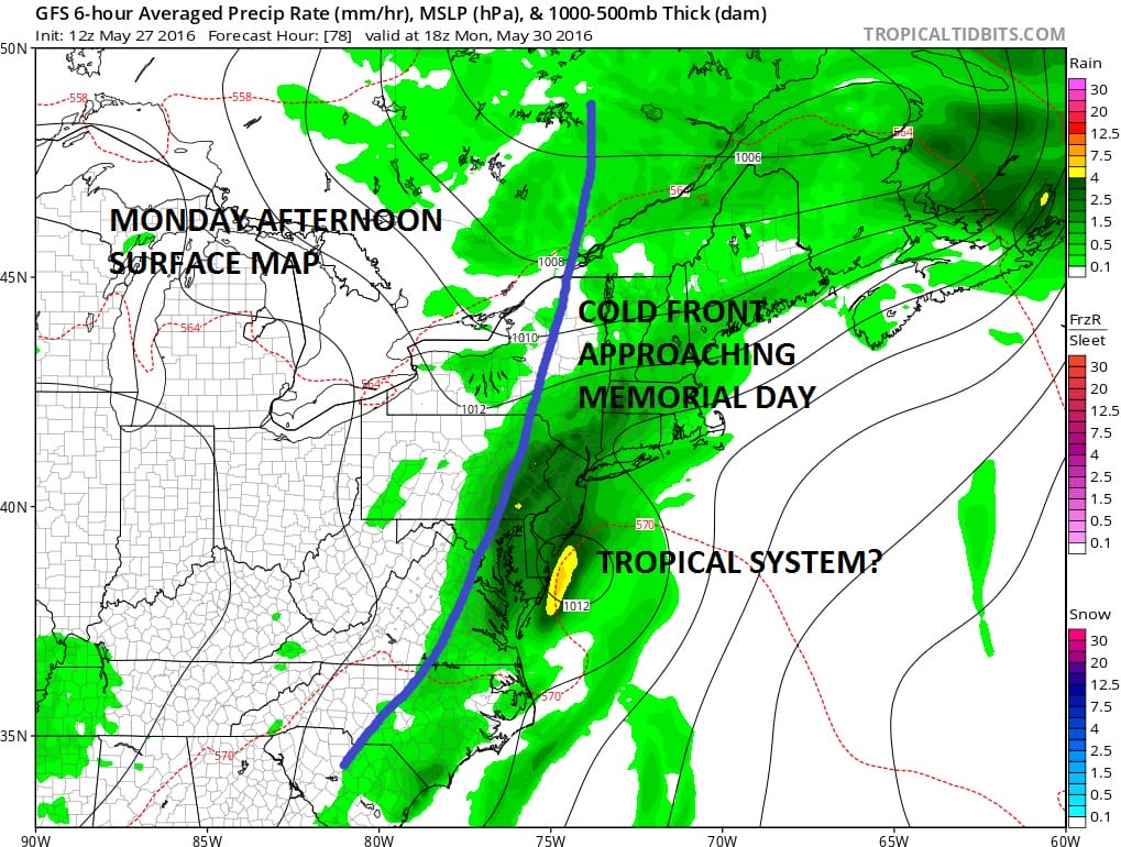 Sunday night and Memorial Day Hinges On Tropical System off the southeast coast. Weather models are bringing a cold front through on Monday which will have a few showers, however now models want to entrain the tropical moisture from the tropical system and bring those rains up here.