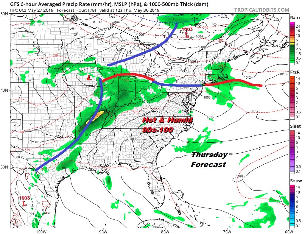 Thursday will be very warm and humid with some sunshine. Highs in most places will be in the 80s to near 90 degrees. Thursday night brings a cold front through from the west and that puts us at risk for showers and thunderstorms yet again. The front passes and weather conditions improve for Friday with some sunshine. Actually i have an optimistic view for Friday through Sunday in general wear it might not necessarily be picture perfect but it may be nice of the enough most of the time. Right now the be is some sunshine Friday and Saturday with perhaps a few scattered showers early Sunday morning (if at all). and then some sunshine on Sunday.