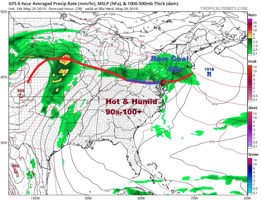 Tuesday through Thursday we will be battling with a frontal boundary to the south and a developing onshore flow. The question remains whether some of the hot humid air to the south gets in here at some point. It won’t happen on Tuesday. Look for cloudy skies with an ocean wind and some rain moving in. Highs will be just be into the 60s from NYC north and east with 60s and 70s to the south. We may have to wait until Thursday to see temperatures to rise back into the 80s. Wednesday will likely be another day with clouds and the chance for showers. Highs in the 60s north and east of NYC and 70s to the south. Finally on Friday a cold front will move through with showers and thunderstorms followed by dry air and sunshine next Saturday and another chance for showers next Sunday.