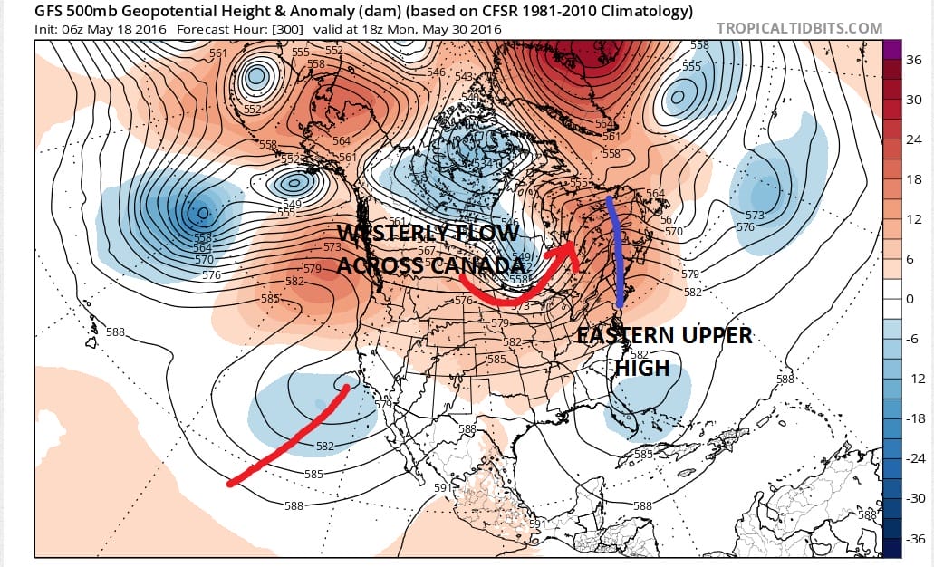 The upper flow going into later next week and for the holiday weekend would suggest a warmer than normal look to things in the East and Northeast with a nice little ridge that pops up and a rather gentle westerly flow across Southern Canada bringing fronts through from time to time. It seems that once we are done with whatever happens with the second coastal low later next week, we could be in fairly good shape for the Memorial Day Weekend Weather outllook. However clearly at this stage we are still a long way out so bear that in mind. Im not saying anything specific at this point. We should also note that there has been a tendency this month for onshore flows to develop as higher pressures seem to be continually building to our north. We can’t rule out the possibility that more of an onshore flow develops which would change this outlook.
