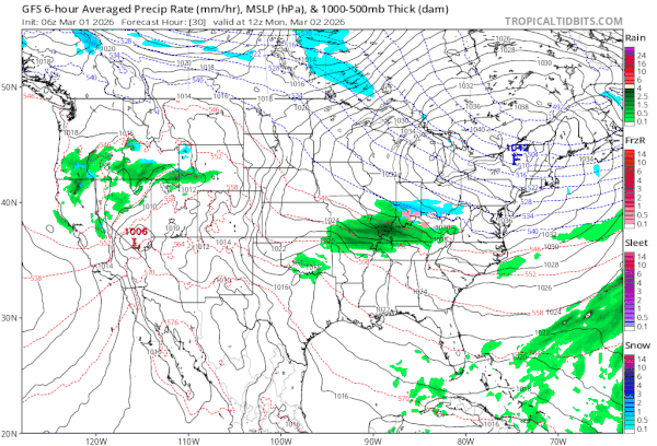 In the meantime we have Monday which will be a very cold day even though we will have plenty of sunshine. High temperatures will be only in the upper 20s and lower 30s which is 15 degrees or so below average for early March. This cold air mass however will be exiting quickly as a warmer pattern begins to take hold Tuesday. Pacific air is flooding the US with warmer temperatures and some of that warm air is heading to the Northeast and Mid Atlantic states.
