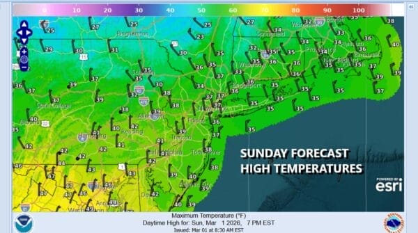 A wave on a frontal boundary to the south has moved through this morning. An area of snow sleet and a little rain has play it’s way through from west to east and now we will spend the rest of the day with improving weather conditions though it is cold. Northerly winds are ushering in a cold start to the month of March and a cold start to meteorological spring which begins today. Temperatures this afternoon will hold mostly in the low to middle 30s with gusty northerly winds and then under clear skies tonight we will see temperatures drop to Monday morning lows in the teens to near 20 degrees.