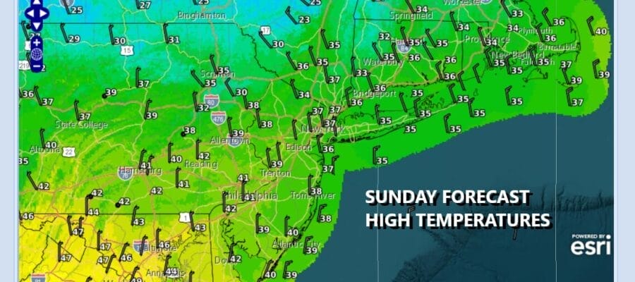 In that transition to a warmer pattern, two areas of low pressure are heading to the northeast into the Great Lakes. Tuesday sees increasing clouds with rain developing late in the day lasting into early Wednesday. It might still be cold enough for some inland areas like Northeast Pennsylvania, Northwest New Jersey, the Hudson Valley and Connecticut from Interstate 84 north, to see a little sleet or freezing rain at the start before it goes to plain rain. Temperatures Tuesday will top out in the upper 30s to mid 40s. Then Wednesday we see some improvement with highs reaching the 50s. Thursday to me looks like it could be the warmest day of the work week with highs in the 60s especially away from the ocean. There is also the likelihood of some showers late Thursday into early Friday as a cold front passes. All in all after the early week cold, it is going to feel like spring around here.