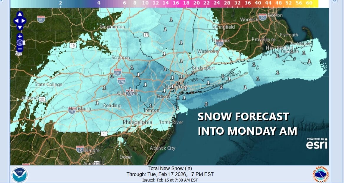 The northern fringe of the precipitation changes to sleet and snow. Areas from North Central New Jersey to New York City and Long Island might see a coating to an inch with an outside chance for 2 inches in some places. South in New Jersey from Interstate 195 it is all rain with maybe a few snowflakes at the end. I really do not see much in the way of upside here as this lasts all of 6 hours or so from start to finish. Precipitation starts between 7pm and 10pm and it is long gone by daybreak Monday.