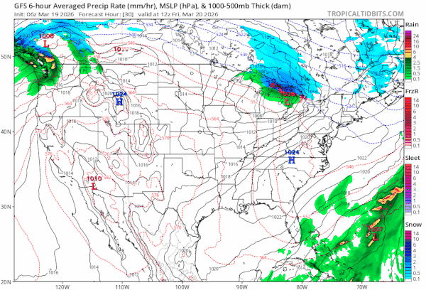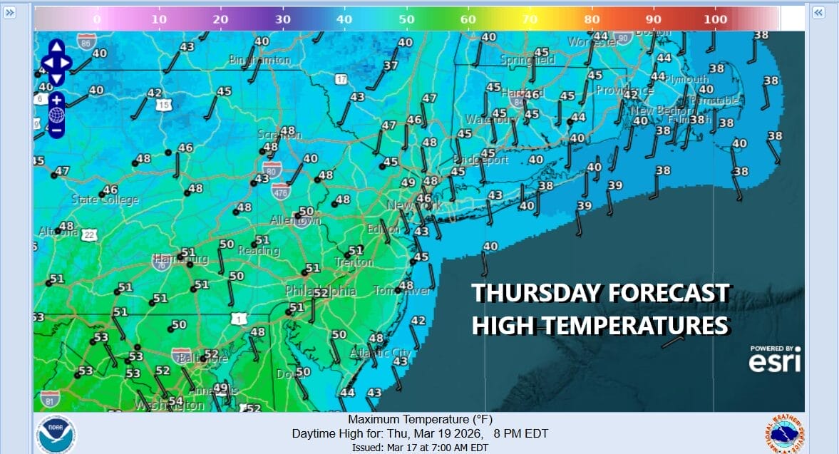 Today is Saint Joseph’s Day and for all the Joe’s out there, happy name day. We are trying to moderate our way out of a cold air mass and we should have some success today as temperatures rise to the upper 40s and lower 50s. We probably would go higher than that were it not for clouds. We can see them moving east and southeast from a broad upper air disturbance moving through the Great Lakes and Northeast. Precipitation with this is well to the north. Across Eastern Pennsylvania to Southern New England we may see some breaks of sun through the clouds and highs will reach the upper 40s and lower 50s. Probably there will be more sun as you head south and less as you head north.