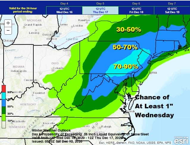 It is still early to throw out numbers on this but an early guess could be the potential for some areas to see 6 inches or more. The Weather Prediction Center in their long range outlook has increased the probability in the Day 5 forecast to 50 to 70% chance of at least an inch and they continue to pull the area of high probability further south toward the coast which makes sense. For now we will say that snow arrives later in the day Wednesday and lasts into Thursday morning. Some areas could see a change to sleet and rain for awhile Wednesday night.