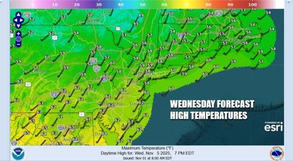 The roller coaster continues Friday as another front approaches so it should be a day of sunshine for the most part and a southwest wind. Highs will reach back into the 60s. Then another cold front will pass Friday night into Saturday morning with some showers. The amount of rain from the cold fronts is minimal. We should see weather improve Saturday but we are setting up for a shot of very cold air for this time of year which will begin to arrive Sunday night and be firmly planted in the Eastern US for the first half of next week.