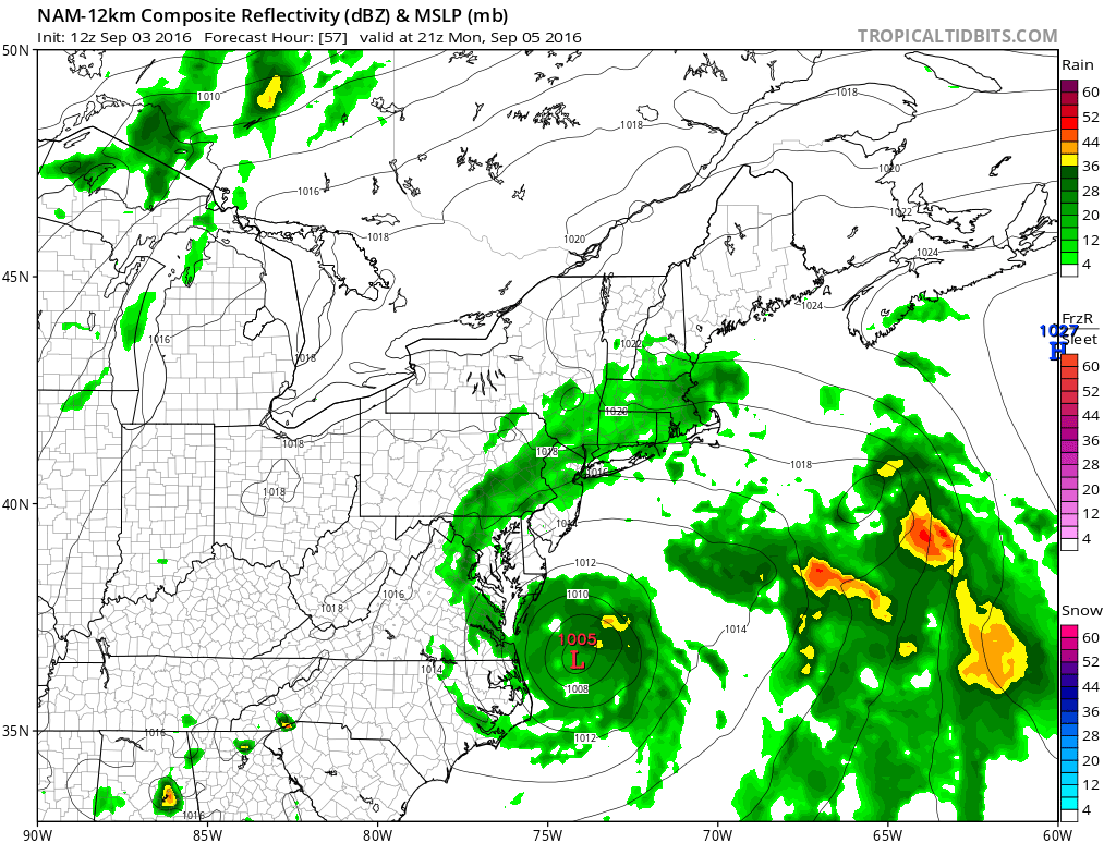 The question is what do we make of this in terms of a forecast. Well frankly not much at this point obviously because we are going to wait and see what the global models do. But it could be an indicator regarding the fact that this hybrid like storm that is developing from Hermine may be something different in terms of the outcome. Models seem to be having a very difficult time with run to run volatility. By late Monday the NAM has back almost to just east of the North Carolina/Virginia Coastline and becoming tropical looking again!