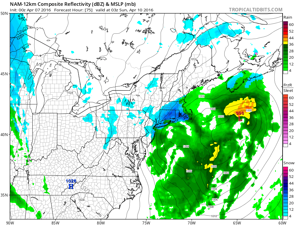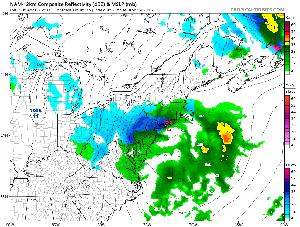We are getting run to run shifts and we need to be alert to the fact that there will be more run to run shifts over the next 2 days. Tonight’s NAM model run shifts northward along the coast and brings wet snow and rain to New York City and Southern New England. Now we really need to be very careful here from a forecast standpoint. The NAM model was colder on this run as well and produced more wet snow than prior runs. However bear in mind this is a spring storm and not a winter storm. Spring storms behave differently. Not only do we have the be cautious on what it shows but also by what the model doesn’t show.