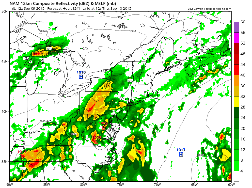 First off with regards to the arrival of the cold front, the nam does not show much through this evening.Much of the shower and thunderstorm activity is well to the north and west of the area which really isn’t too much of a surprise. The main action will come from the developing wave during the day Thursday and Thurday night and this seems to make the most sense.What is encouraging with regards to rain is that the model does develop some very large patches of moderate to heavy rain and they seem to get enhanced during the day as the wave develops and gets going just to our south. There should be some local amounts in excess of 2 inches of rain if the model is correct.