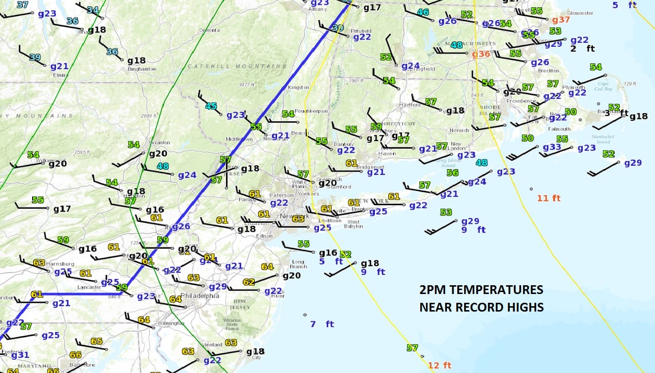 Looking at the surface map this aftenoon as of 2pm we have near record highs around the region most temperatures in the low to mid 60s! Islip tied a record high as of 2pm at 62 which was set a year ago! The surface map also shows the cold front is getting ready to move through. Behind the front temperatures are in the 30s and that air should begin moving in over the next few hours.