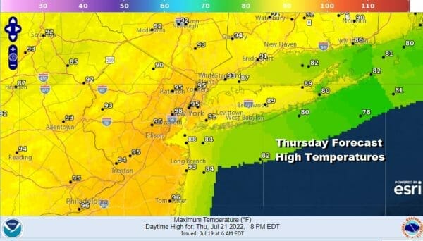 Right now Thursday is setting up to be the hottest day of the week with highs in many areas reaching the middle 90s. Humidity levels will be quite high so it will feel like it is over 100 degrees. As far as the cold front that approaches late in the day, the Storm Prediction Center has Northern New Jersey in severe weather risk with general thunderstorm risk elsewhere in the state.