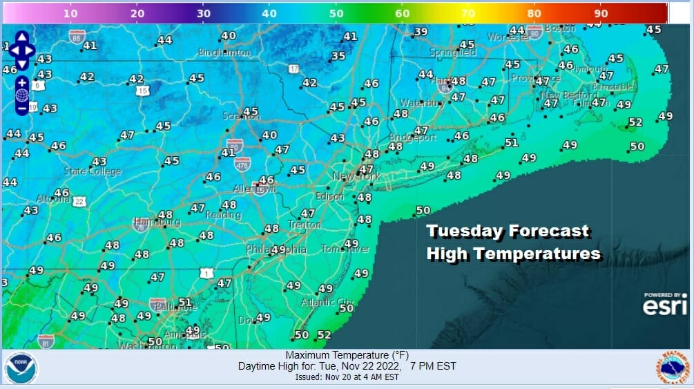 For Eastern Pennsylvania, New Jersey, the Hudson Valley and Connecticut there are no weather issues through at least Thursday Thanksgiving day. Tuesday highs will be in the mid to upper 40s. Wednesday highs will be in the low to mid 50s with sunshine. Thursday Thanksgiving Day we will have sunshine but it will be a shade cooler with highs in the upper 40s and lower 50s. Southern New Jersey could see highs in the middle 50s both Wednesday and Thursday. There are no issues travelling to your destination, or perhaps you have family members coming to you. There are no weather issues with rain or snow until perhaps late Friday as the next front and storm system heads our way.